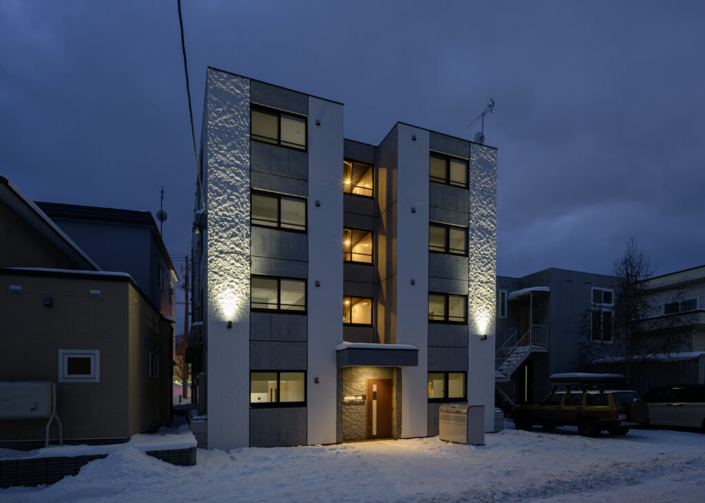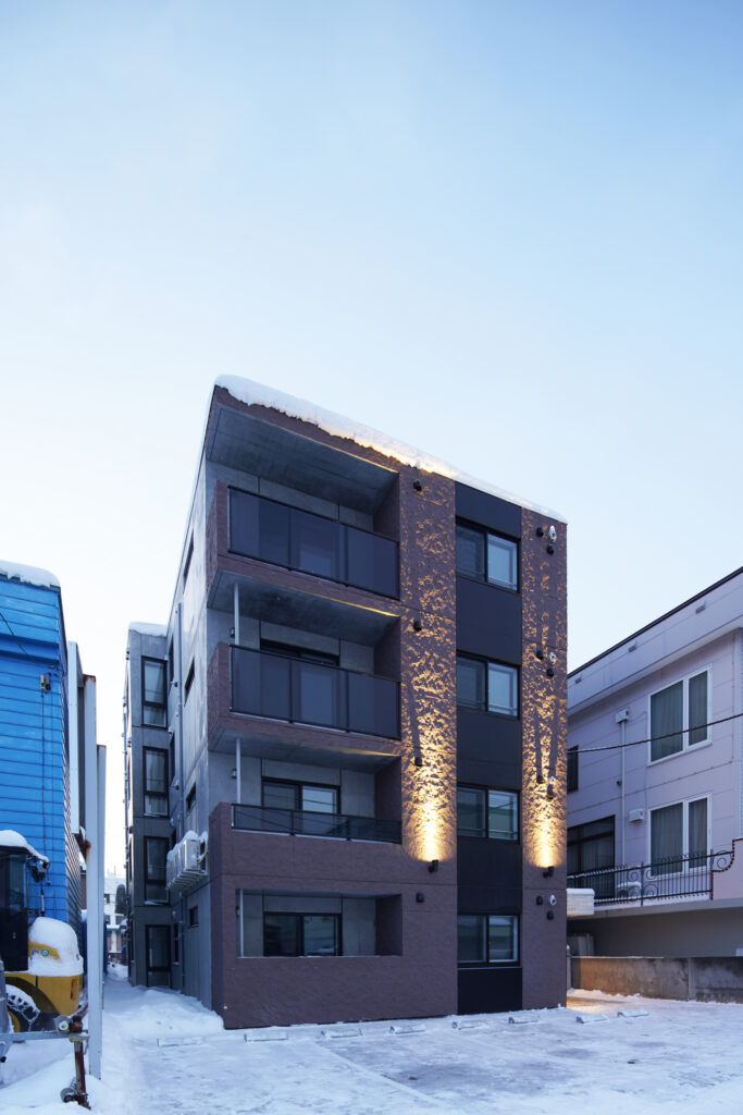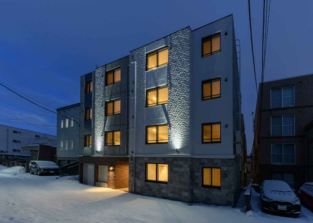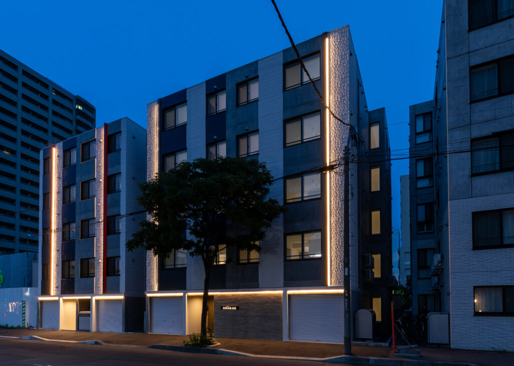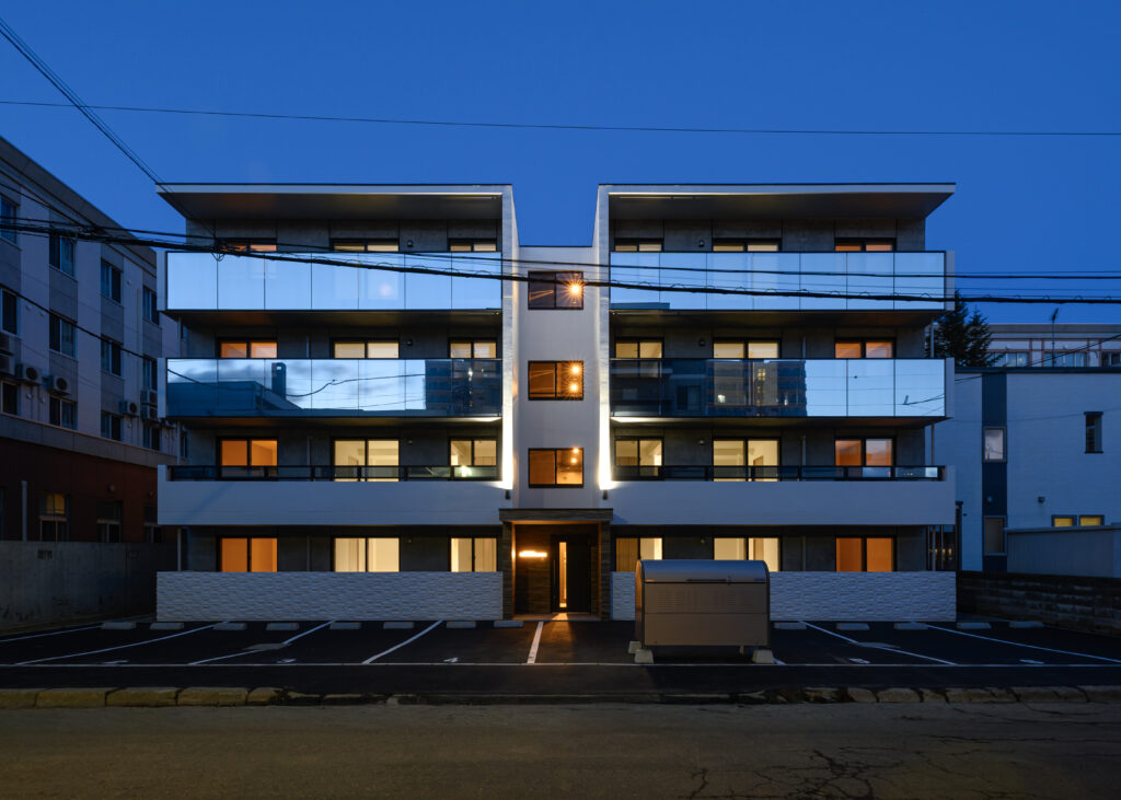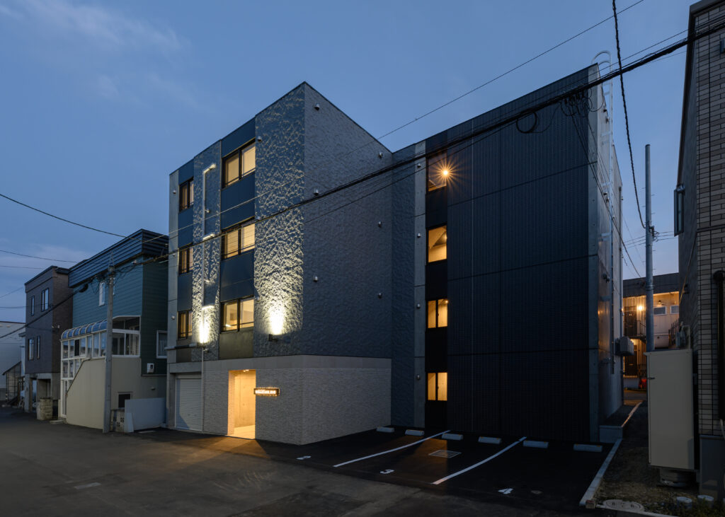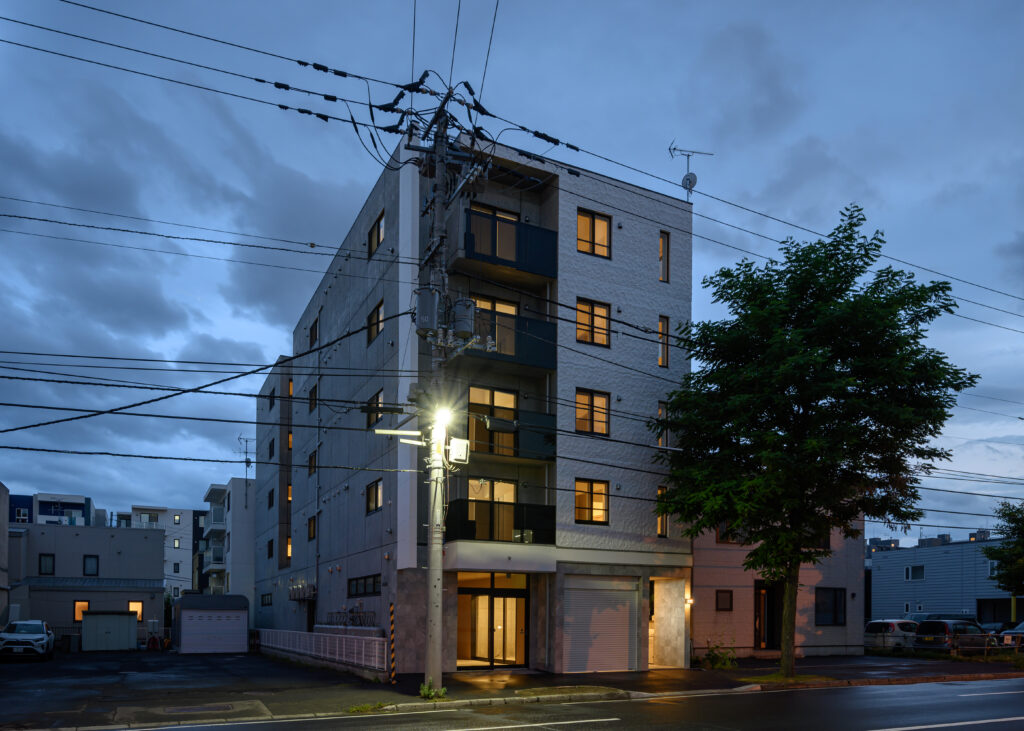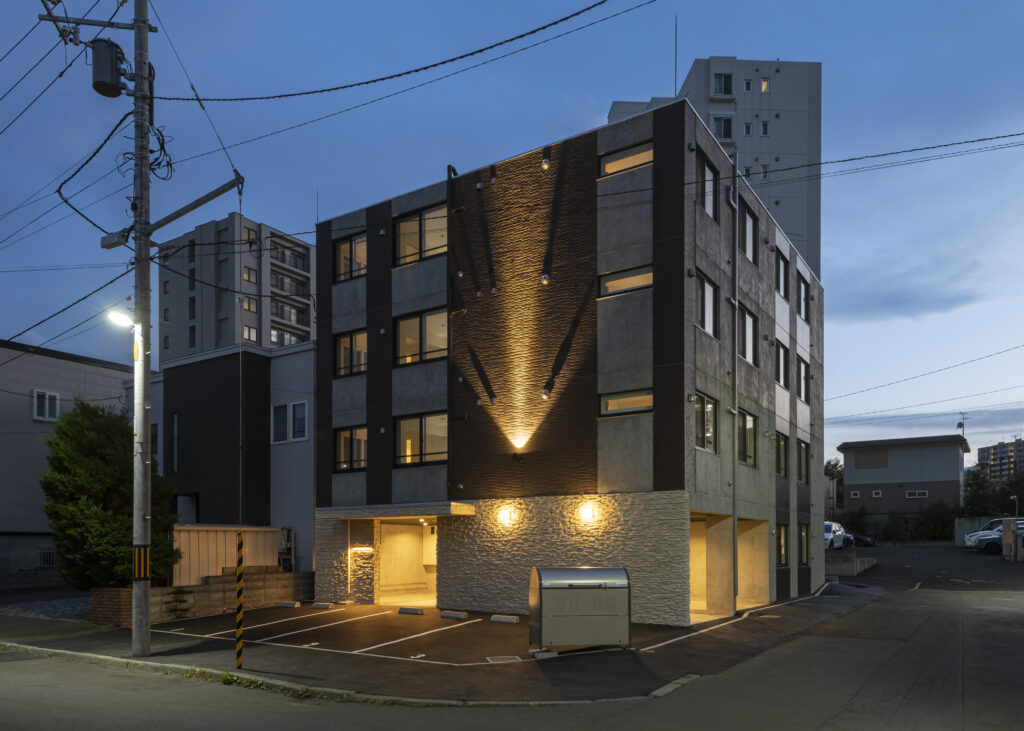 概要:集合住宅(12戸)所在地:札幌市北区麻生町7丁目敷地面積:216.08㎡ / 延べ床面積:482.63㎡ / 竣工:2025年9月 …