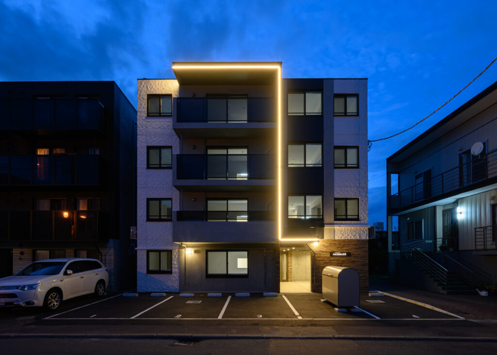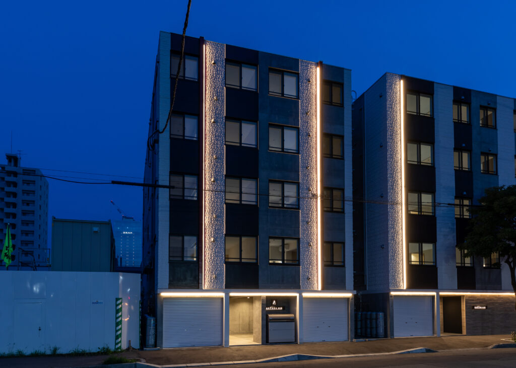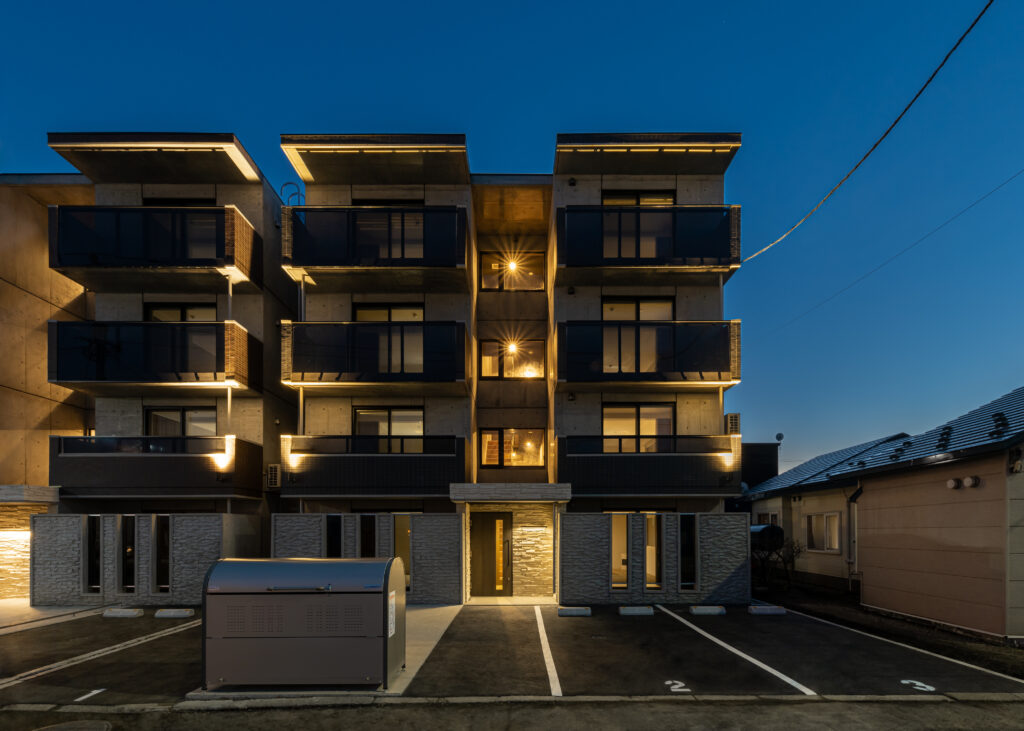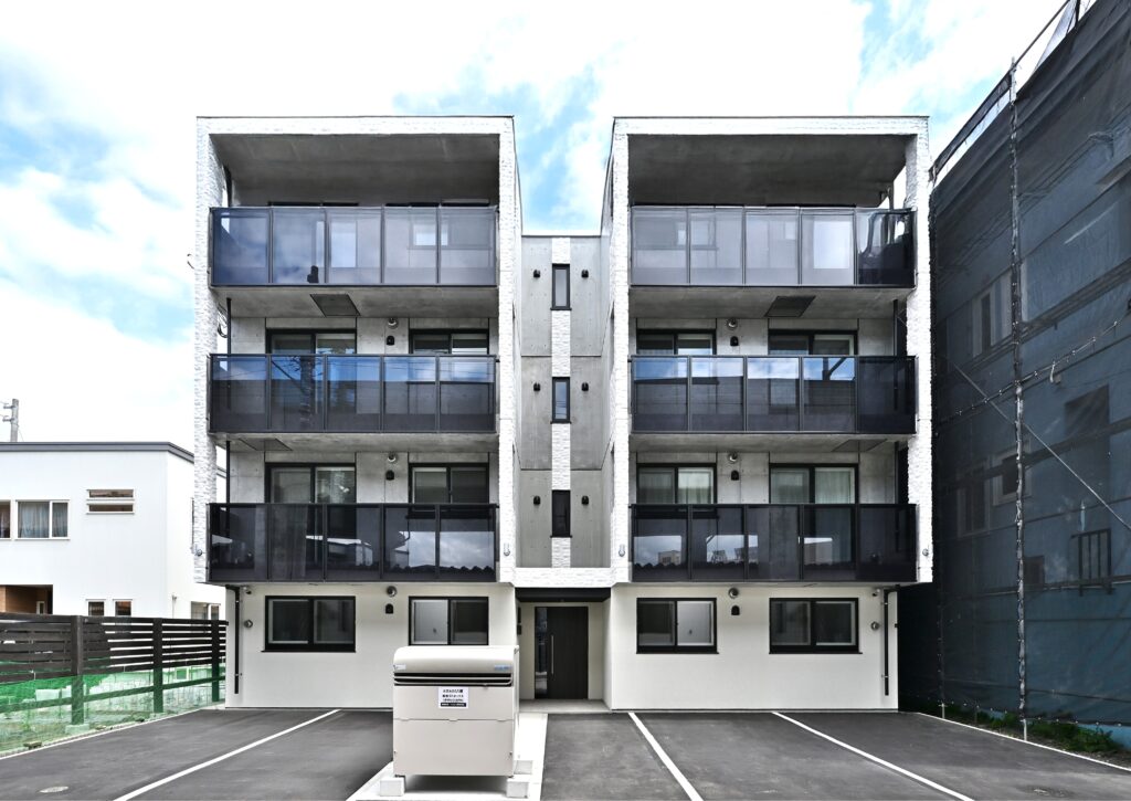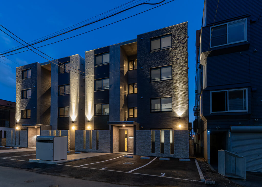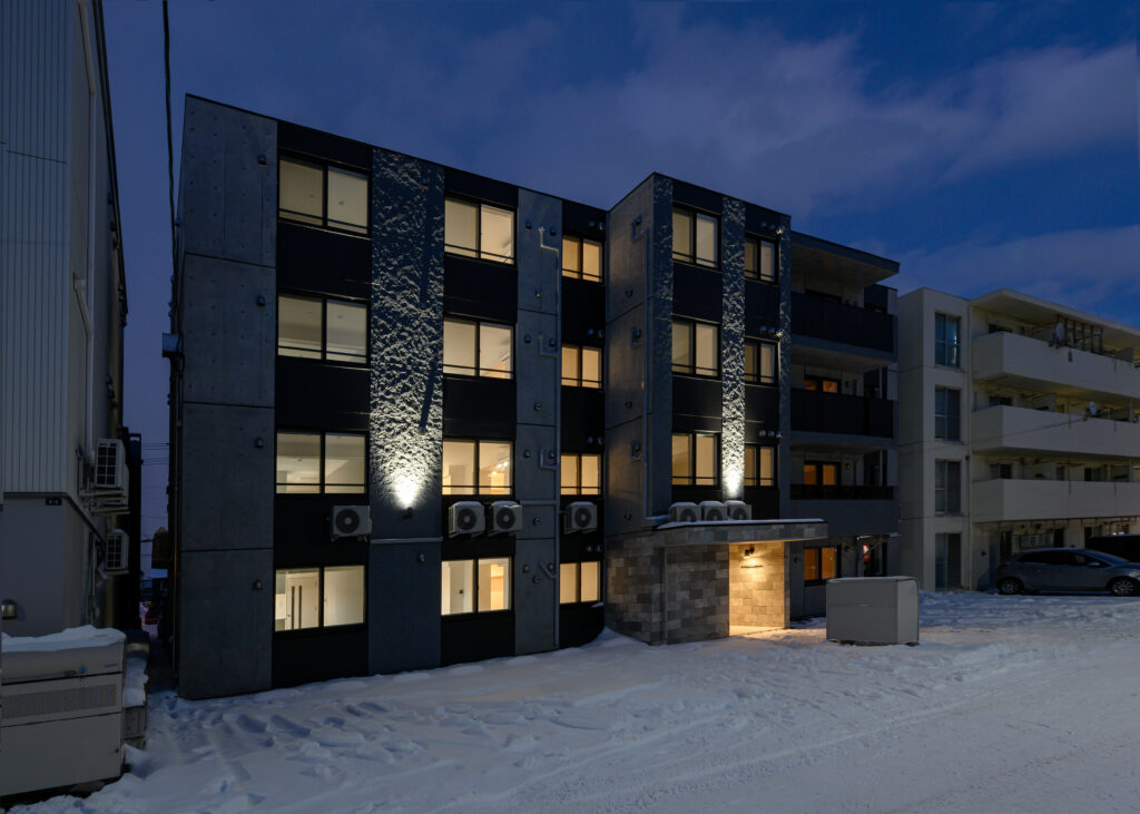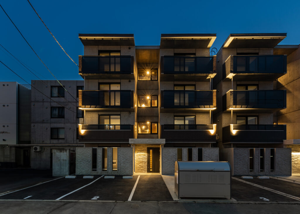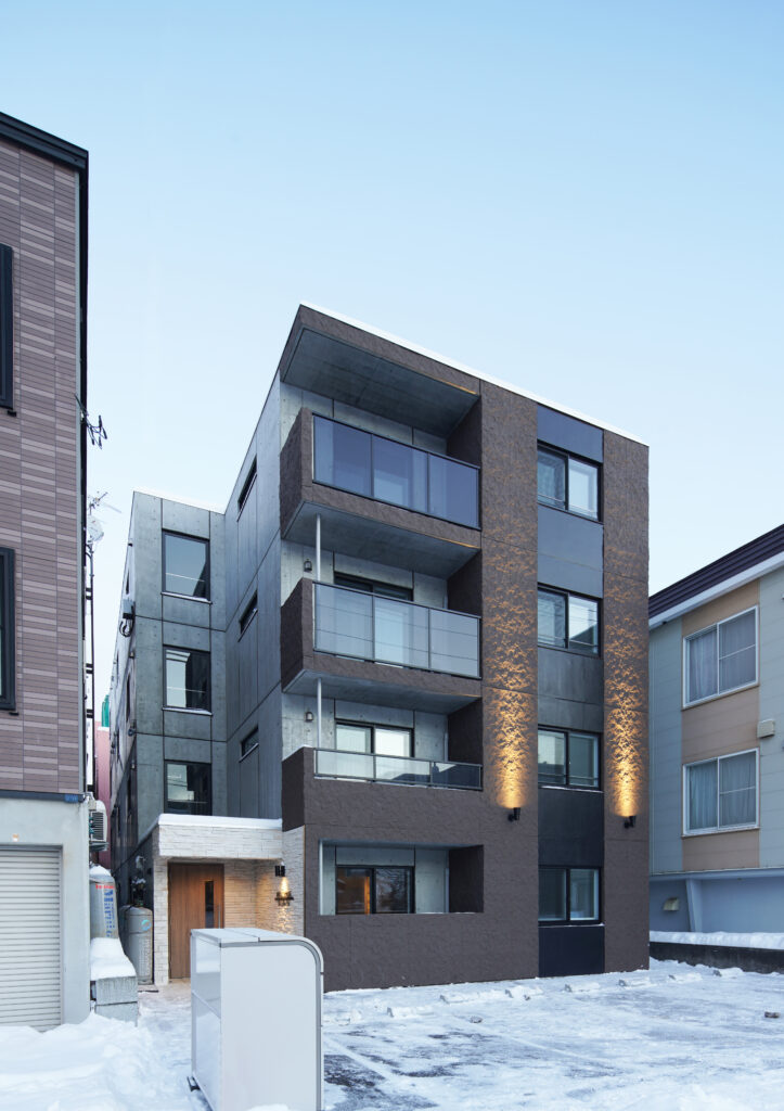 概要:集合住宅(12戸)所在地:札幌市北区麻生町7丁目敷地面積:216.08㎡ / 延べ床面積:482.63㎡ / 竣工:2025年9月 …