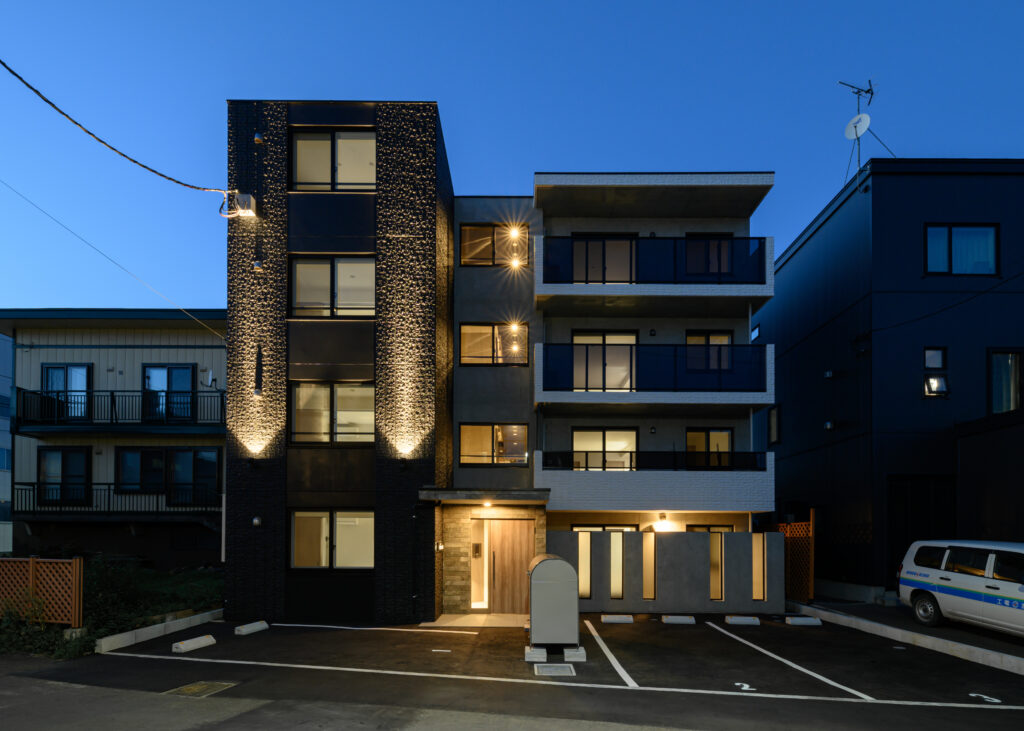 CLARICE麻生概要:集合住宅(15戸)所在地:札幌市北区北38条西8丁目敷地面積:230.78㎡ / 延べ床面積:546.46㎡ / 竣工:2025年9月 Construct…