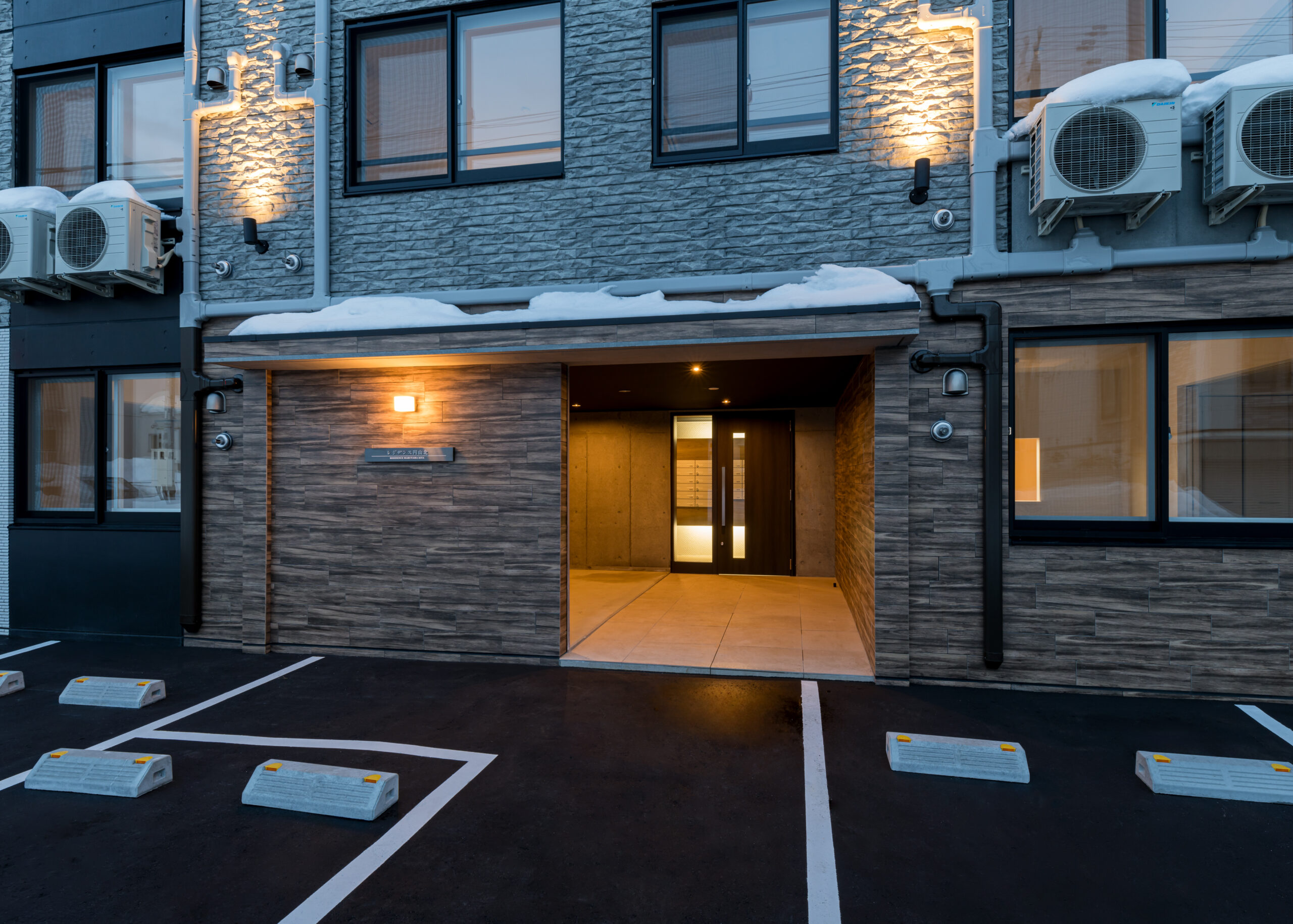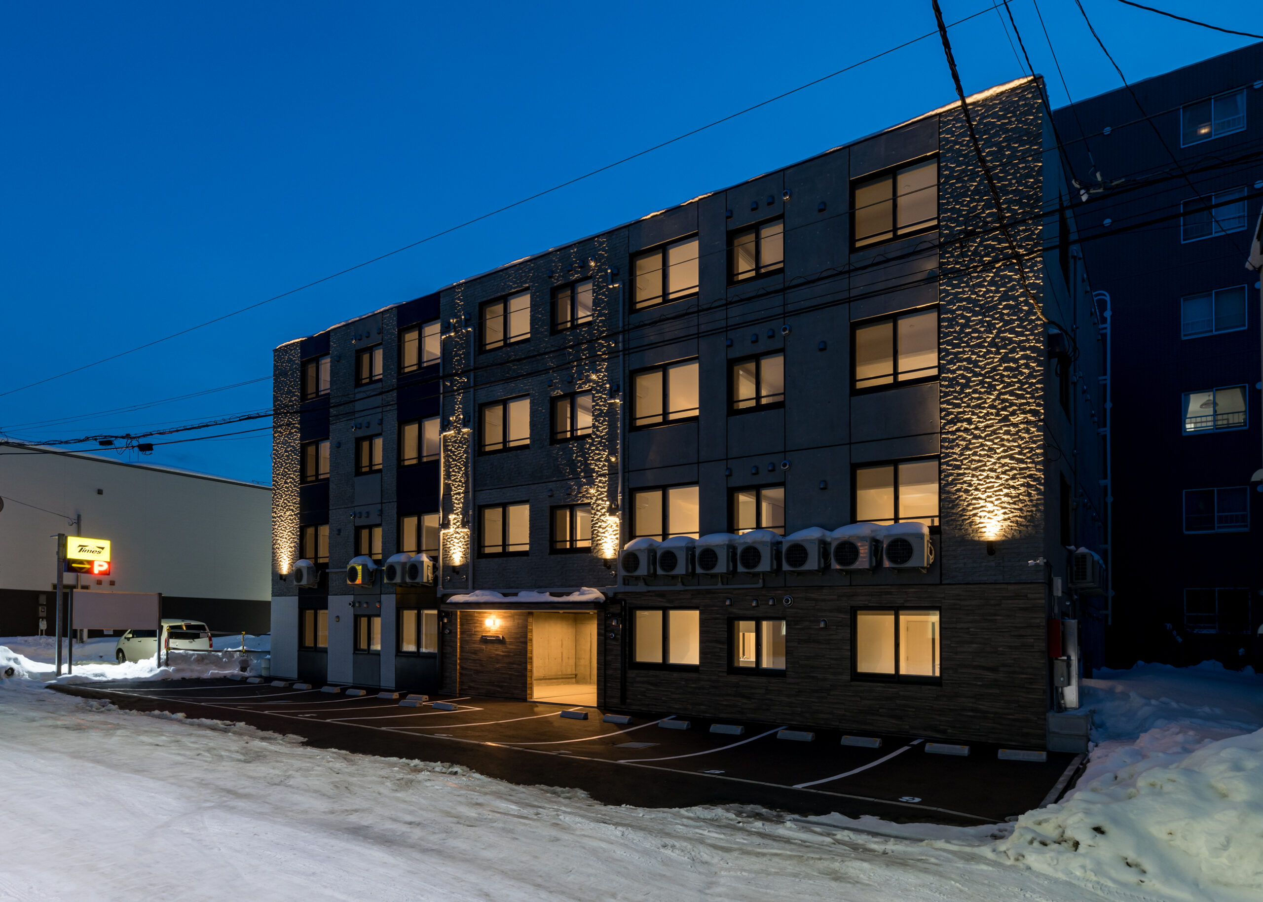 | 概要:集合住宅(27戸) 所在地:札幌市中央区北8条西24丁目 敷地面積:413.33㎡ / 延べ床面積:413.33㎡ / 竣工:2024年2月 |